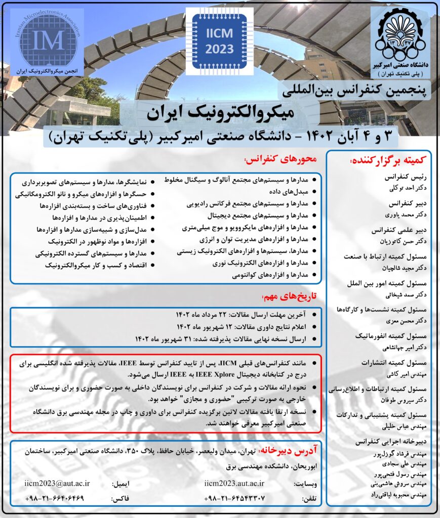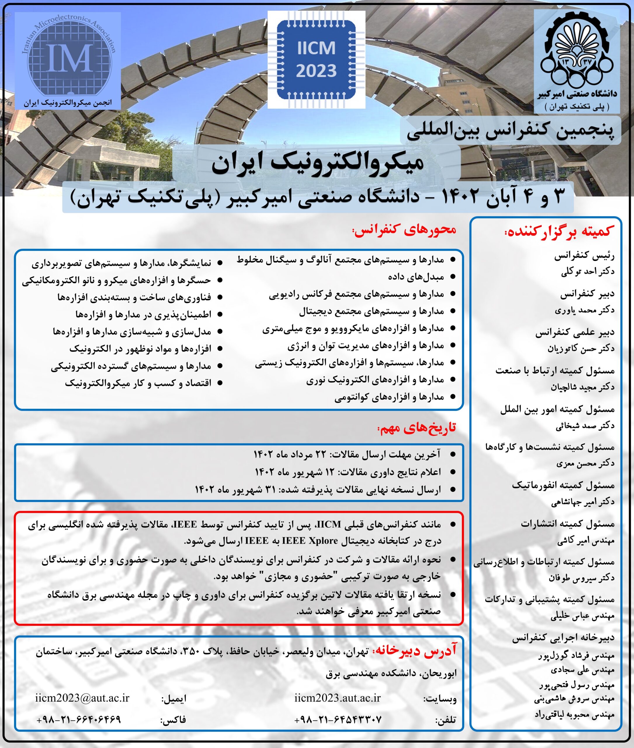 دانشگاه صنعتی امیرکبیر (پلی تکنیک تهران) مفتخر است پنجمین دوره کنفرانس بینالمللی میکروالکترونیک ایران را با مشارکت پیشکسوتان و نخبگان ایرانی داخل و خارج کشور و حمایت عالیه دانشگاههای معتبر در تاریخ 3 الی 4 آبان ماه 1402 در تهران برگزار نماید.
